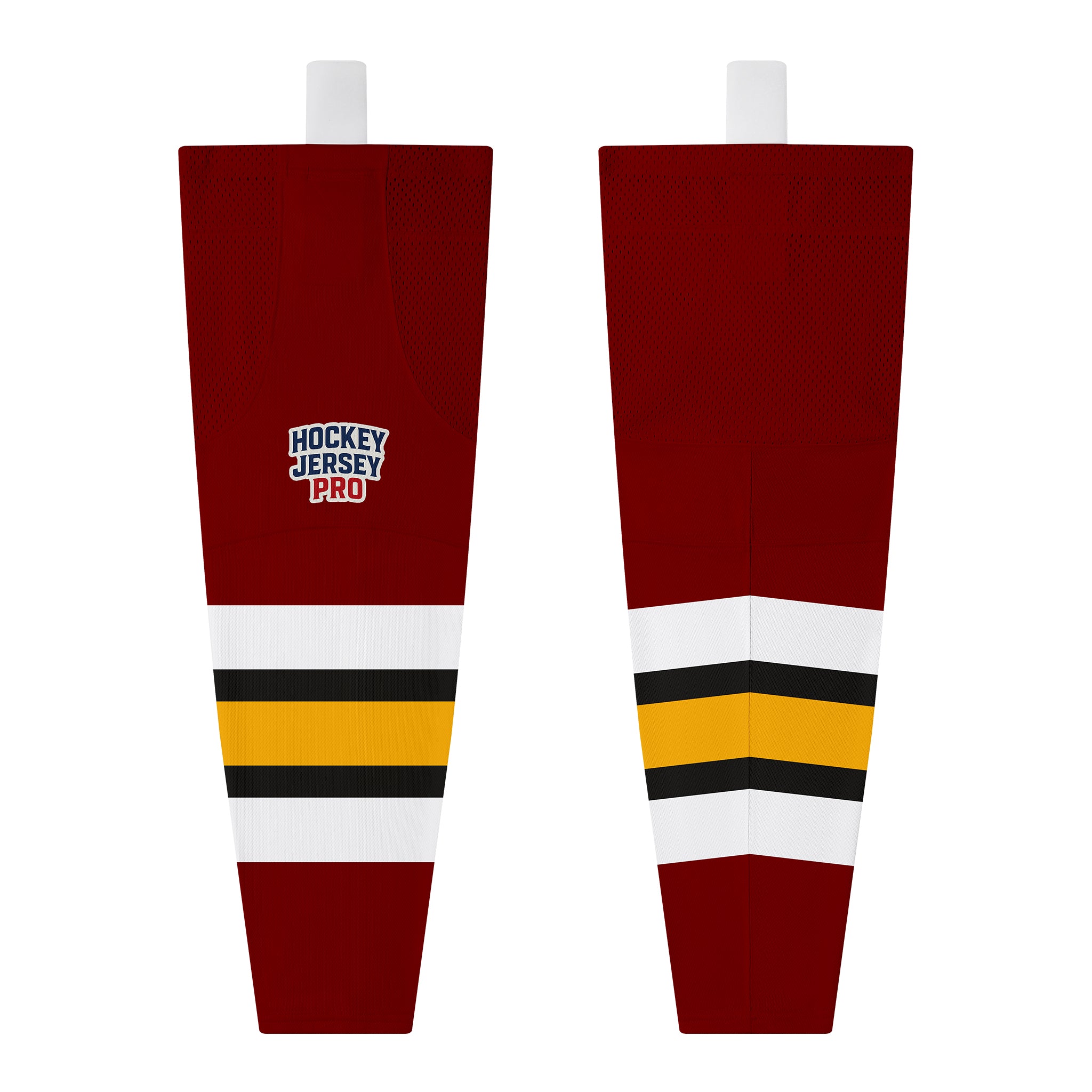 Coordinated hockey socks constructed to maintain fit, color consistency, and stripe alignment throughout the season